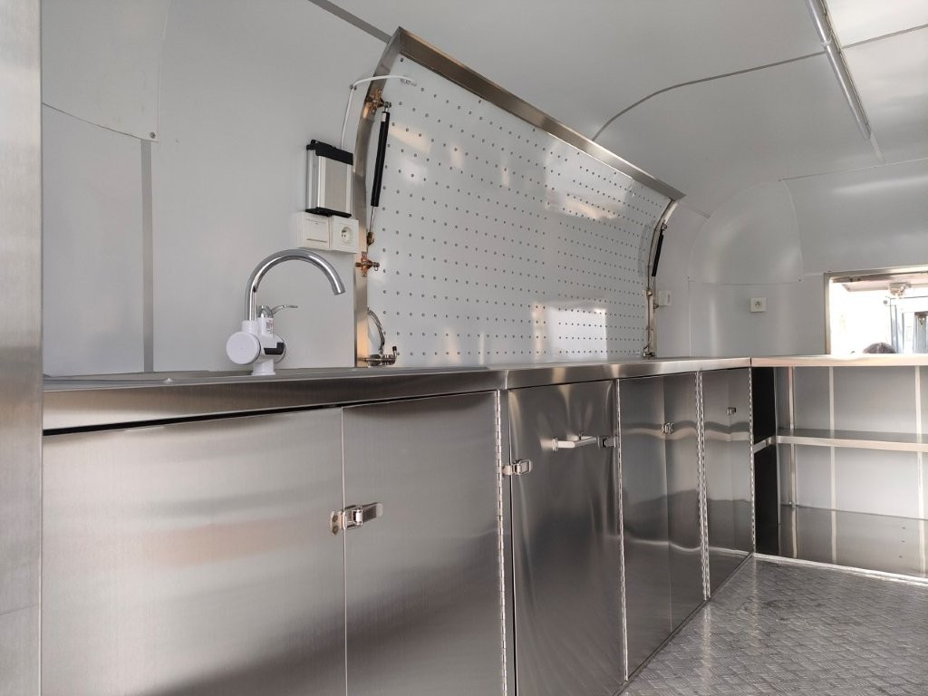 Der Retro Trailer Modell Airstream ermöglicht maximalen Nutzen auf kompaktem Raum. Die funktionale Innenausstattung lässt keine Wünsche offen. Wichtige Elemente sind Edelstahl poliert als Außenschale, 40 mm dicke Isolierung und Edelstahl bzw Kunststoff ihnen, Fußboden auf rutschhemmenden Alublech, große Verkaufsklappe, komplette Innenausstattung schon beim Basismodell und schier unbegrenzte Möglichkeiten durch umfassendes Zubehör.