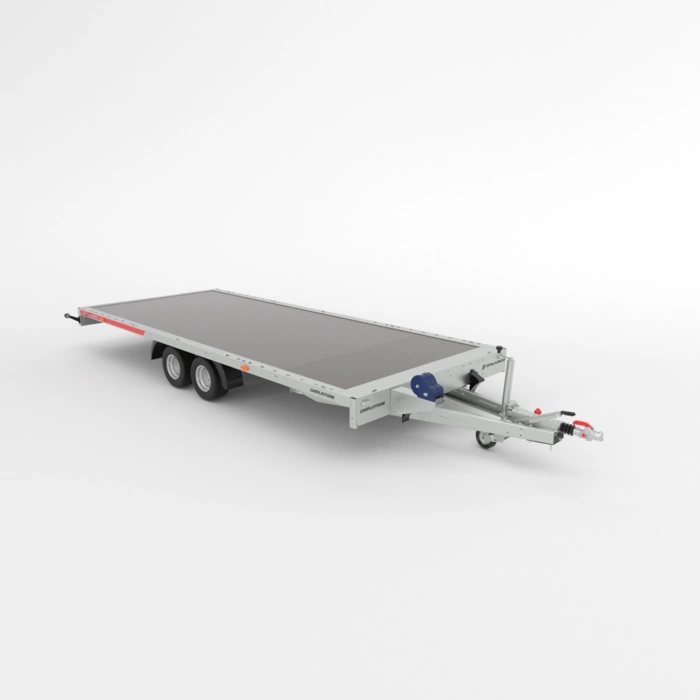 Platform komplett verschweißt und feuerverzinkt, Siebdruckplatte, lange Auffahrrampen, Automatikstützrad und Seilwinde mit Bremse in Serienausstattung.